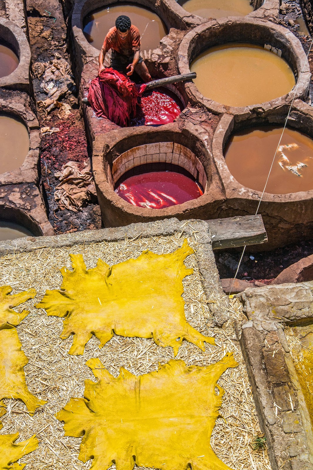 Fes is also well known for its leather. They still treat and dye leather in the old fashioned way. We visited a leather shop overlooking the tannery. It was so fascinating to watch the men at work. They make leather from many animals including cows, sheep, goats and camels. Tanneries smell incredibly horrible. They're always on the outskirts of town because of that reason. The leather shop gave us sprigs of mint to smell as we watched the workers below. They said the smell wasn't too bad that day...but it sure smelled putrid to my sensitive nose!